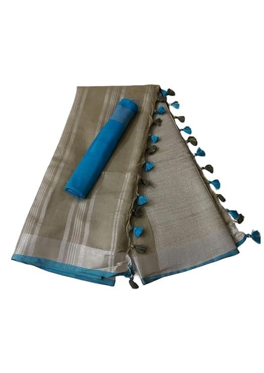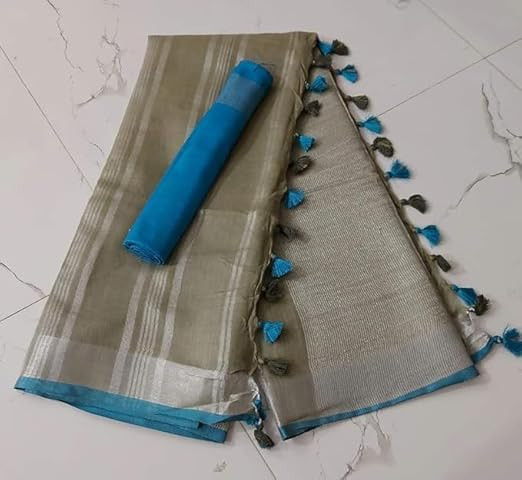 Meticulously crafted from a blend of linen and cotton, offering the best of both worlds in terms of comfort and texture. Handloom Weaving: Each saree is carefully handwoven using traditional techniques, showcasing the artistry and skill of expert craftsmen. Breathable Comfort: The linen-cotton combination ensures breathability, making it an ideal choice for all-day wear in various climates. Intricate Patterns: Adorned with intricate zari border striped designs pallu, adding a touch of timeless elegance to the saree. L x W : 5.5 x 1.1 meters and 0.9 meter Blouse Piece