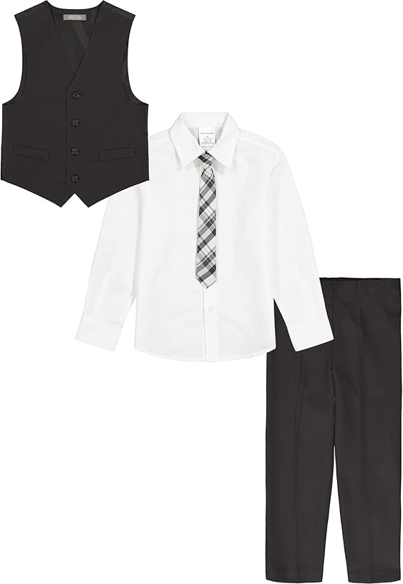Boys' 4-Piece Formal Suit Set, Vest, Pants, Collared Dress Shirt, and Tie.
