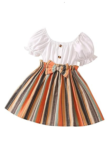 Girls Striped Print Puff Sleeve Bow Front Dress || Stripe Pattern Dress for Kids || A Line Dress || Puff Sleeve Dress for Girls || Casual Dress