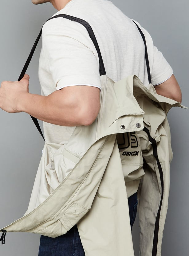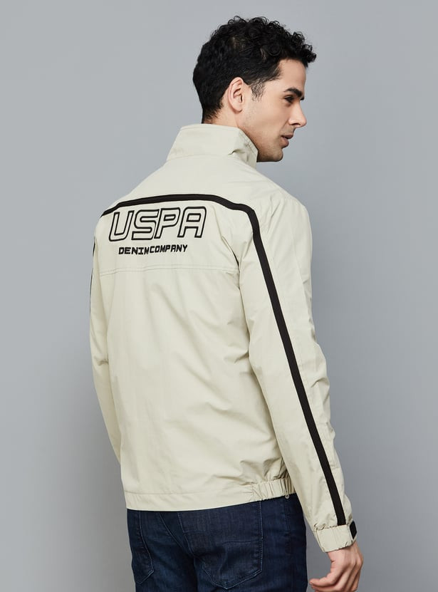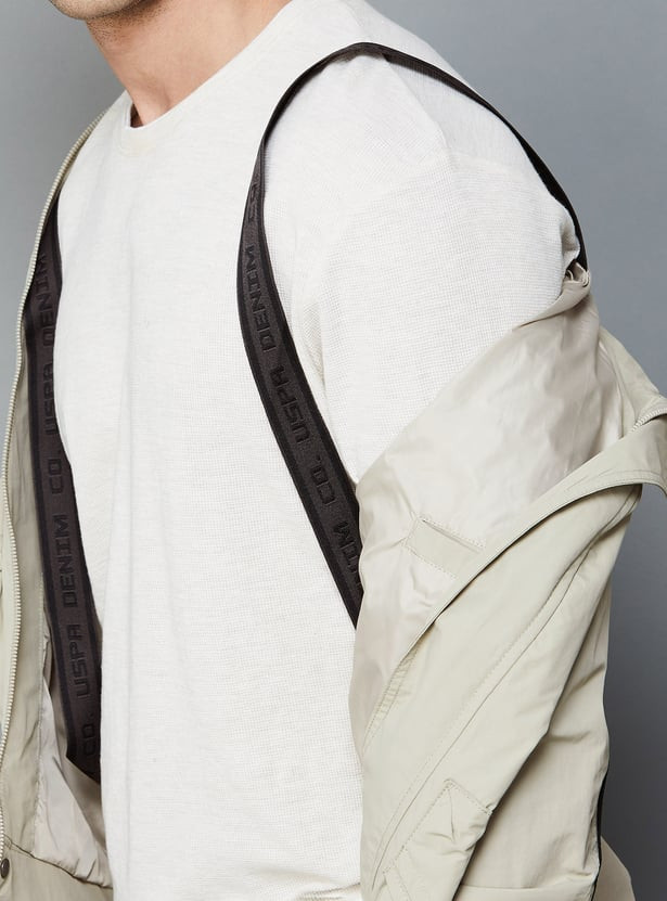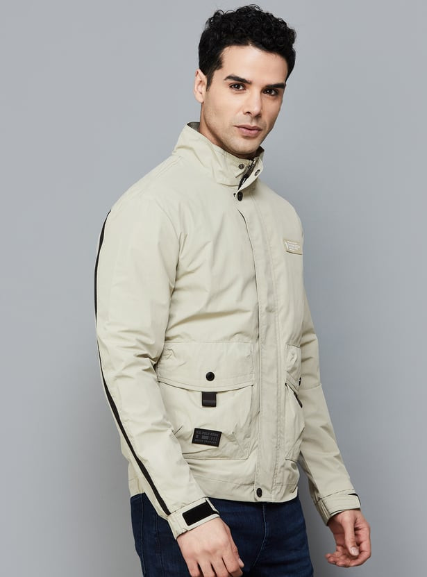 Look effortlessly stylish this winter season with this bomber jacket, designed with a printed surface, zip closure, pockets, and full sleeves. This jacket is also comprised of a button and Velcro closure that will keep you in sync with the fashion trend. The stand collar and shoulder straps keep the jacket at bay.