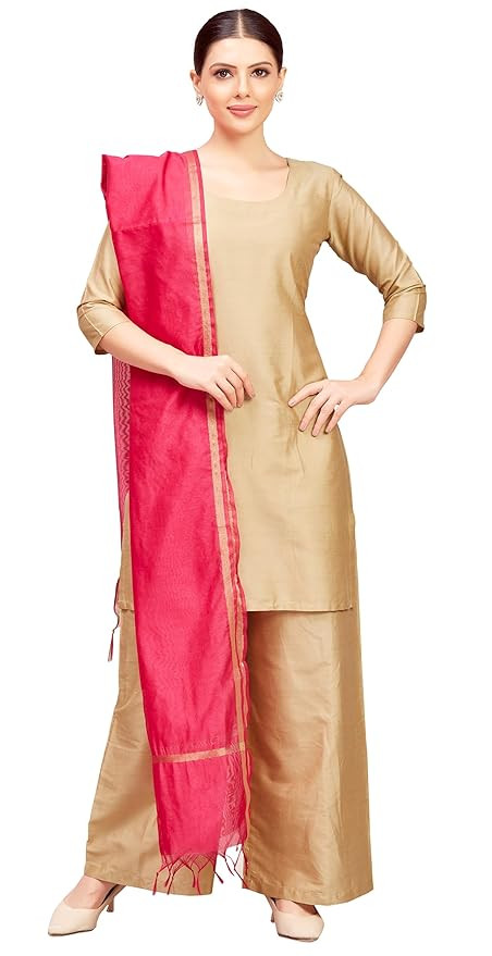The dupatta has golden borders on both sides and the pallu too Beautifull tassels on both ends of the dupatta Available in many colurs