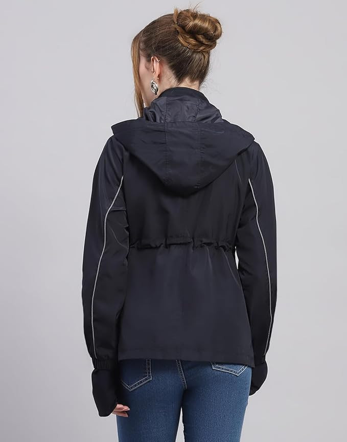 Women's Solid Black Detachable Hood Full Sleeve Jacket