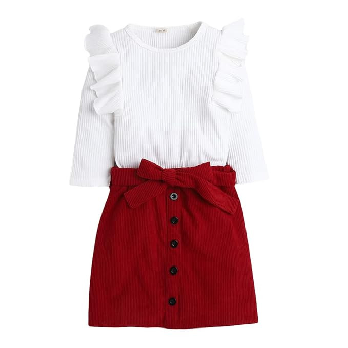 Girl's Cotton and Spandex Solid Ruffled 3/4th Sleeves Top And Skirt Set in White Color