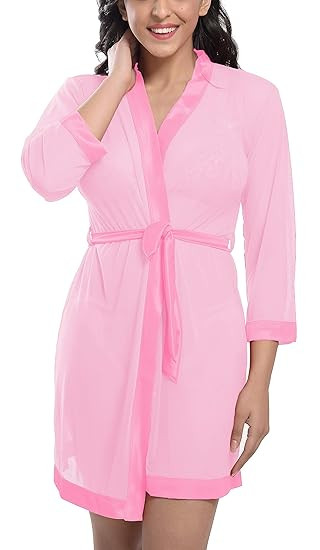 Women's Sheer Mesh Satin Bordered Nightwear Robe with matching g-string panty