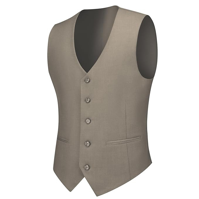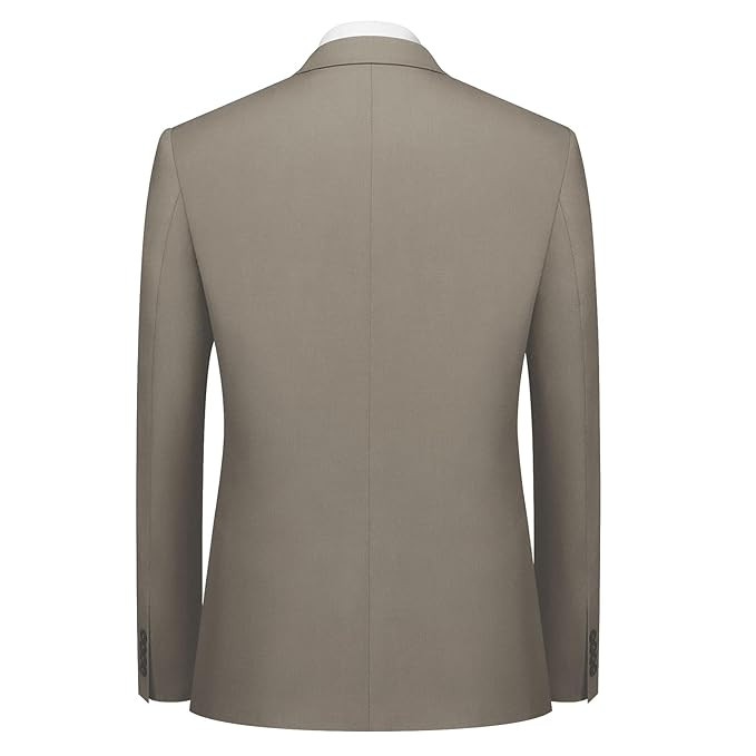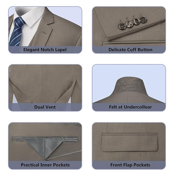 【PREMIUM FABRIC】 With 65% Polyester and 35% Rayon, this slim suit for men is comfortable, breathable, soft and easy to keep the shape. The durable stitching makes the suit have a long lifespan. 【MEN'S SUIT STRUCTURE】 Jacket: Single breasted one button closure/ Notch lapel/ 3 Practical inner pockets/ 4 Sleeve buttons each side/ 2 Front flap pockets/ 1 Real handkerchief pocket; Pants: Flat front/ Expandable waist/ Invisible zipper/ 2 Real back pockets; Vest: 5 buttons/ V-neck vest. 【SUITABLE FOR MUTIPLE SCENES】 Mens tuxedo suit set with a chic tailored look can make you be raved on different occasions, such as weddings, parties, business, prom, date and work. The classic beige suit is also a fantastic gift idea for your male friends. 【WHAT YOU GET & HOW TO KEEP】 With the affordable price, you'll get suit jacket*1, pants*1, vest*1 and tie*1. Dry clean only. Low iron if possible. Remember to hang the slim fit suit when you are not wearing them.