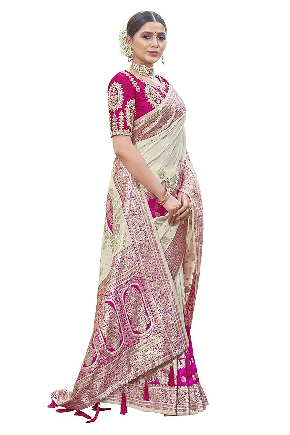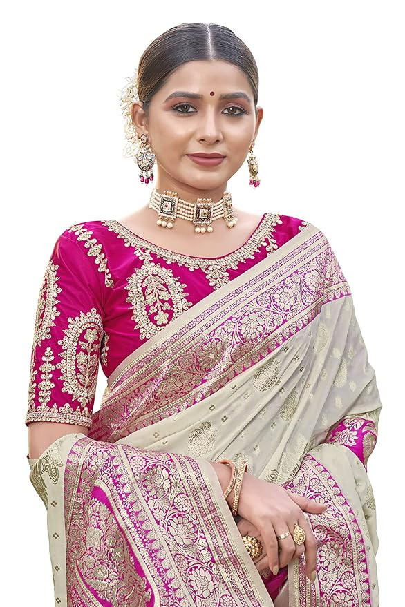 Saree Color: Off White & Pink, Blouse Color: Pink Saree Fabric: Banarasi Silk , Blouse Fabric : Malai Silk Saree Length: 5.5 Meter , Blouse Length: 0.8 Meter Saree comes with unstitched blouse piece,which is attached with end of the saree only. Buyer have to cut blouse part from the saree. Stiching service will not be available. There might be color variation due to screen resolution and digital photography