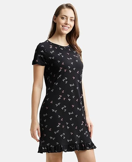 Women's Modal Cotton Ruffled Hem Styled Half Sleeve Printed Sleep Dress Mini Nightdress